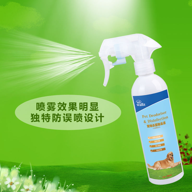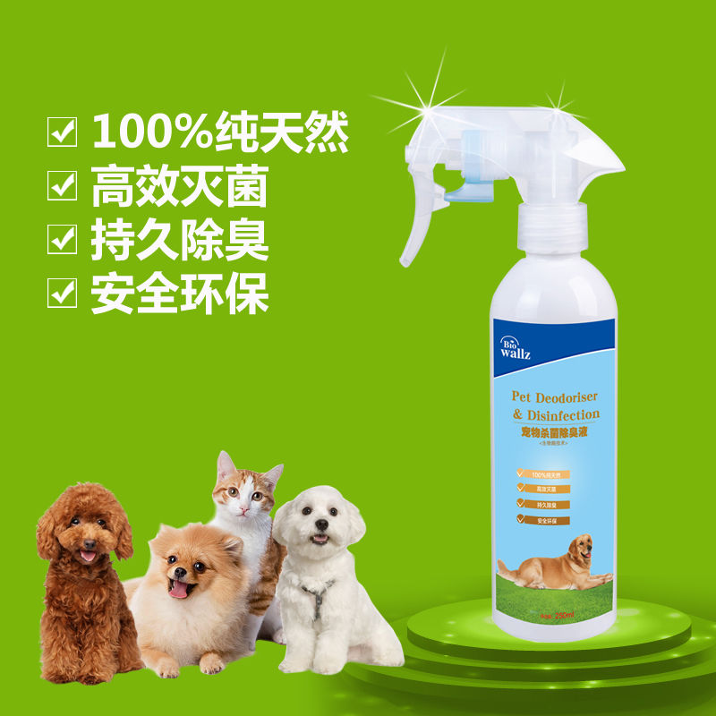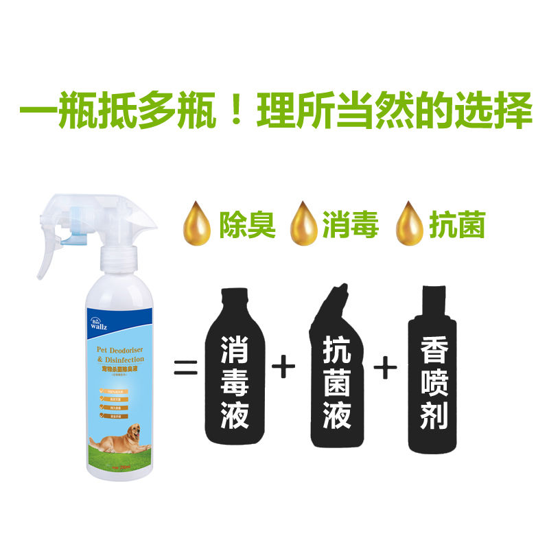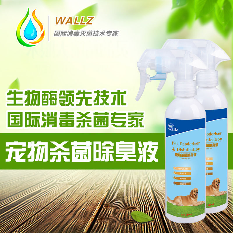 wallz 寵物殺菌除臭液,利用寵物專用生物酶及植物提取液降解尿氨、分解氨氣、硫化氫、甲硫醇、甲硫醚等惡臭物質,分解成無毒無害的物質,廣譜殺滅細菌、病毒、霉菌、真菌等,并抑制腐敗病原微生物生長。本產品含有純天然生物活性物質,高效殺菌,持久祛味,綠色環保,人畜無害,提高寵物居室環境空氣質量,是保持您和寵物健康的最佳選擇。